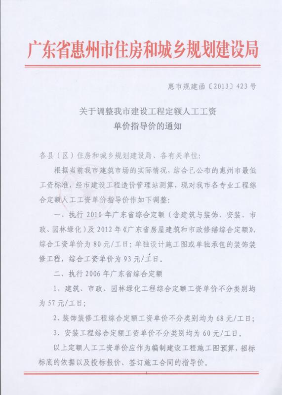 關(guān)于調(diào)整我市建設(shè)工程定額人工工資單價(jià)指導(dǎo)價(jià)的通知(惠市規(guī)建函〔2013〕423號(hào))