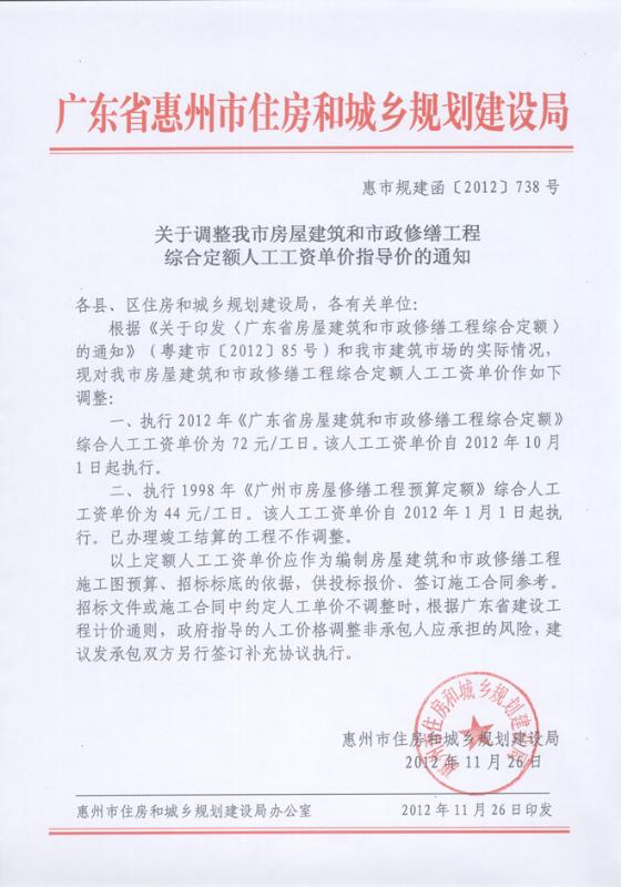 關(guān)于調(diào)整我市房屋建筑和市政修繕工程綜合定額人工工資單價(jià)指導(dǎo)價(jià)的通知(惠市規(guī)建函〔2012〕738號(hào))